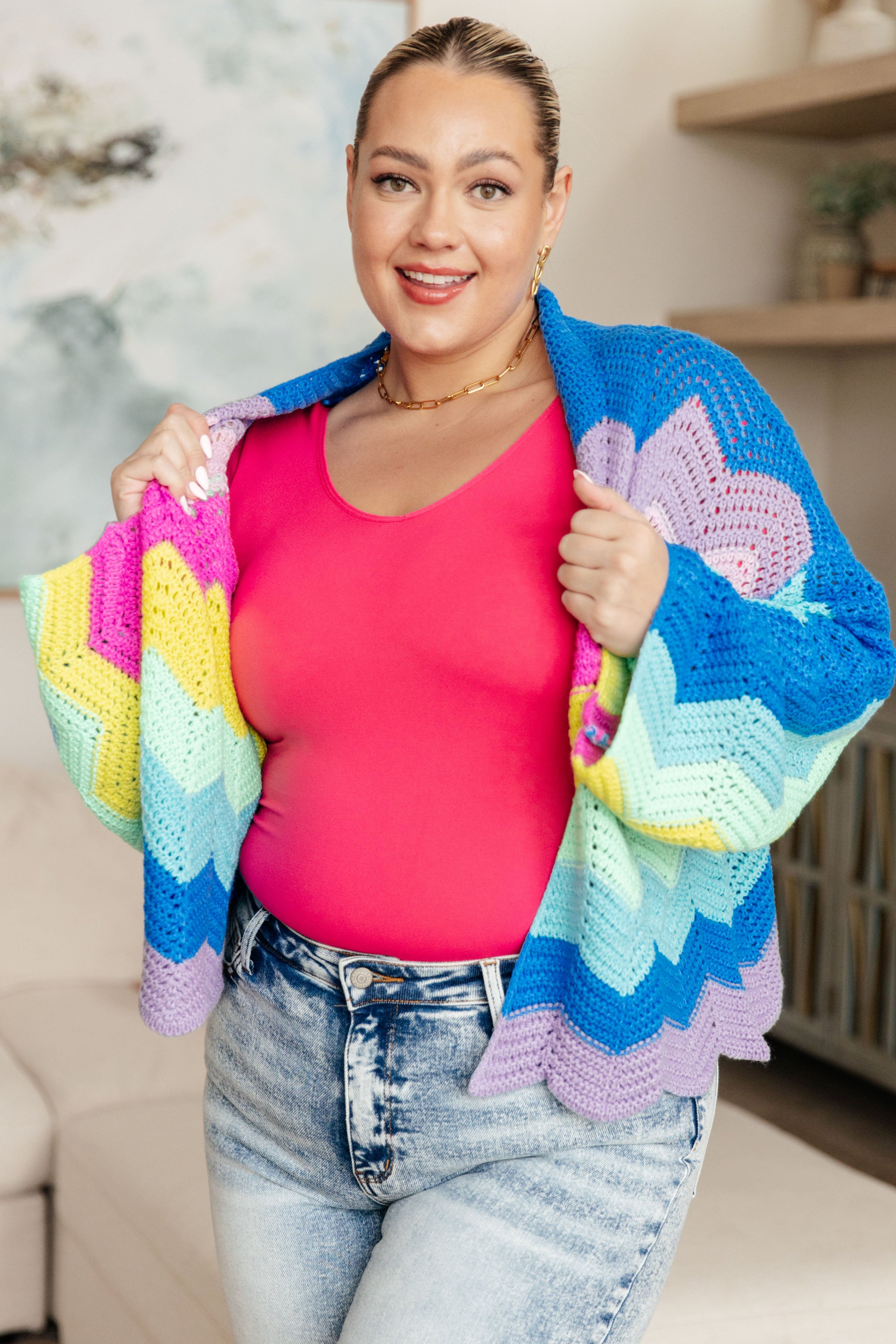Unwind from the day in the Every Single Moment Striped Cardigan. This cozy sweater features a crochet design with a chevron pattern and rainbow stripes. Oversized fit ensures plenty of room for movement and a bright pop of color that will brighten up any look.