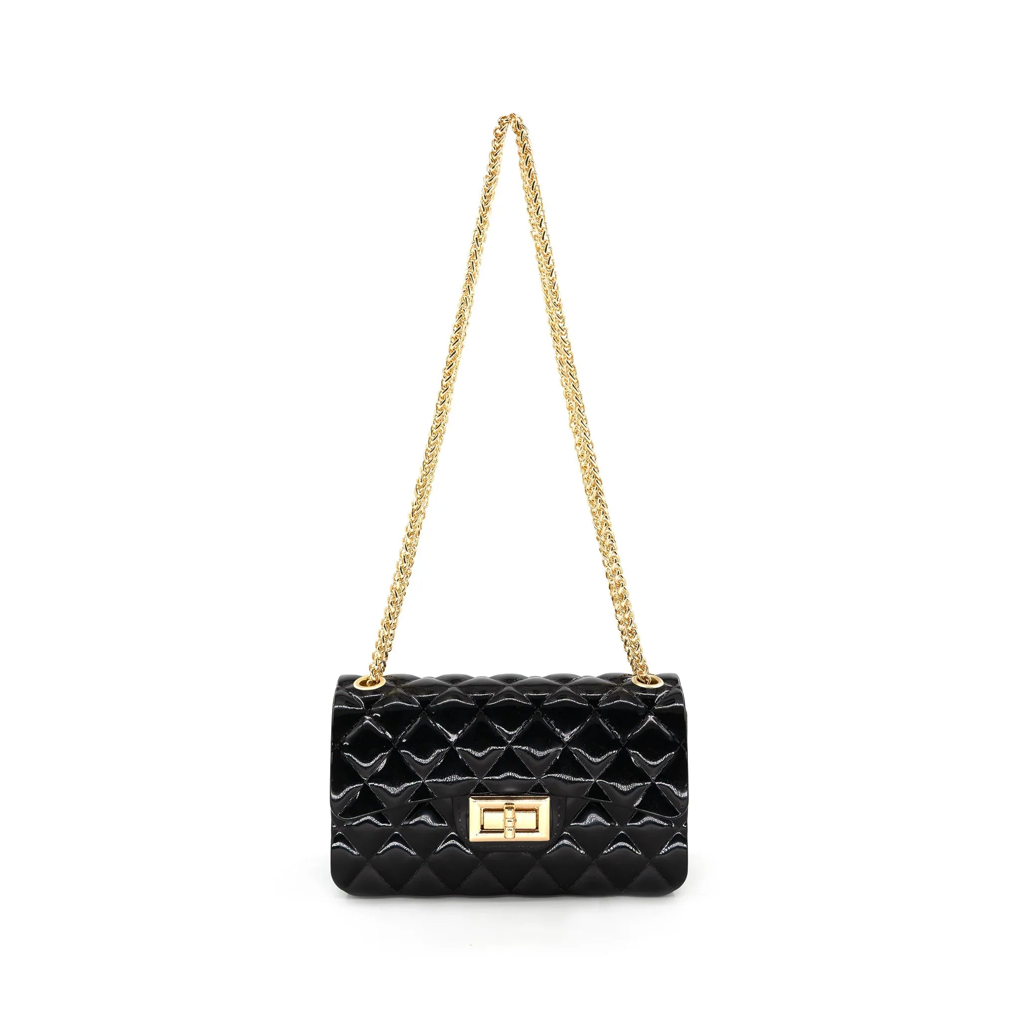 Petit and retro-inspired, yellow Jelly purse featuring an elegant gold chain strap long enough to be worn cross-body style. Measures 7 x 4 x 2.5 inches & matches all your Leetie favorites. Closure and strap are high quality in a gold plating. Nice & light weight, but fits your phone along with a small wallet, a lipstick & all the good things you need. Jelly material is reminiscent of the 'rubber' or plastic used in retro '80's 'Jelly Shoes', only this baby won't give you blisters!